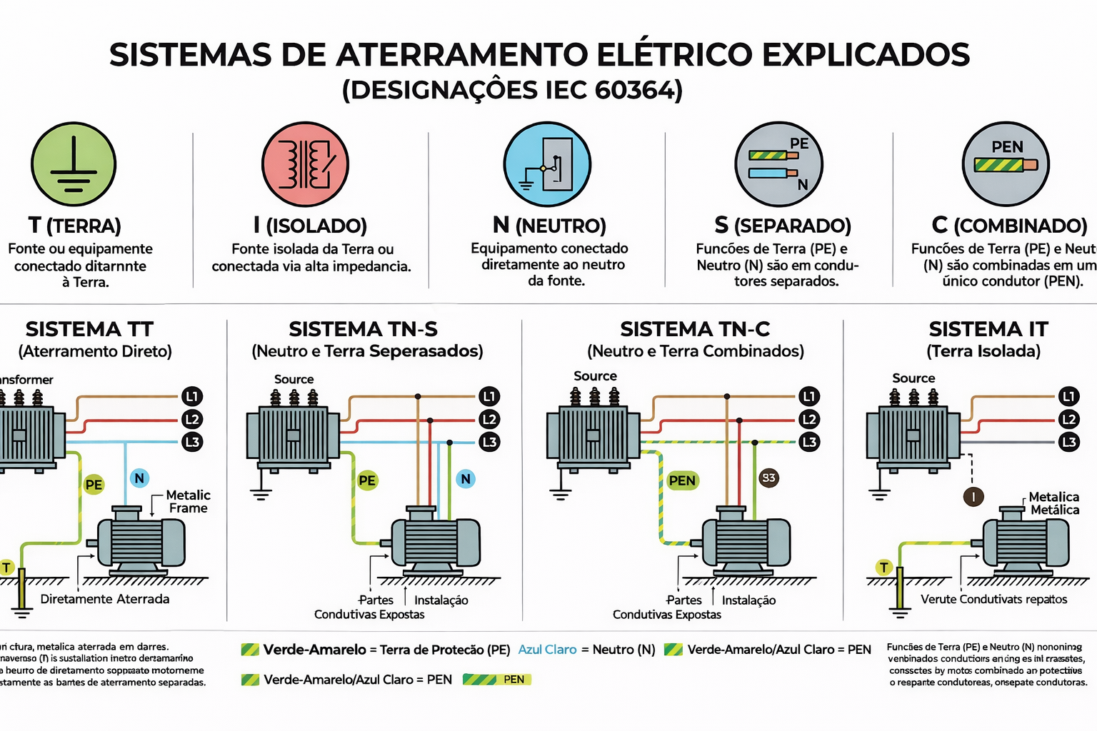 Antes de aprofundarmos em cada sistema, é preciso entender a gramática normativa. A NBR 5410 utiliza um código de letras para descrever a relação da fonte e das massas com a terra. Entender essa lógica elimina a necessidade de “decorar” diagramas.