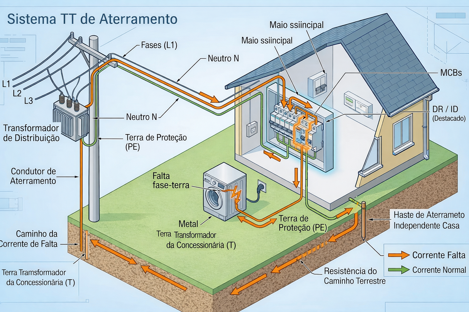 Diferente do TN, onde a corrente de falta retorna pelo condutor metálico, no TT a corrente de falta deve atravessar a terra para retornar à fonte. Como a resistência da terra é muito superior à de um cabo de cobre, a corrente de falta fase-massa costuma ser baixa — muitas vezes insuficiente para desarmar um disjuntor comum.